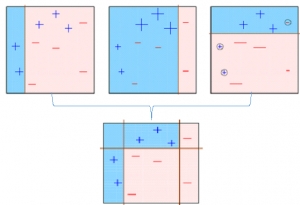 The observations which are incorrectly predicted, are given higher weights. (Here, the three misclassified blue-plus points will be given higher weights)